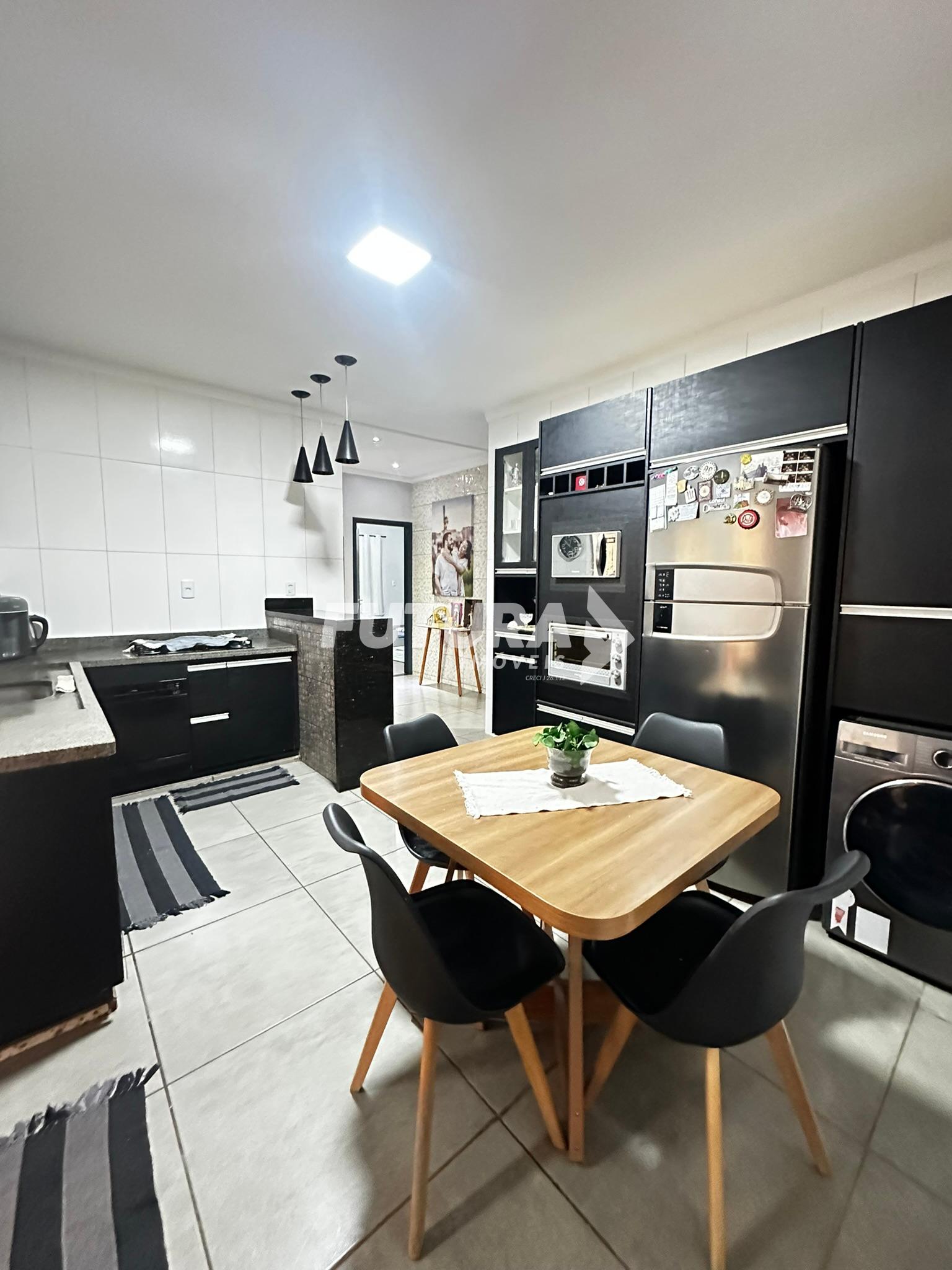 Uma casa com três suítes, um escritório na frente, sala com pé direito alto, cozinha, sala de jantar, varanda, lavabo, lavanderia coberta, garagem coberta para dois carros e 2 descobertos, piscina aquecida, poço artesiano.