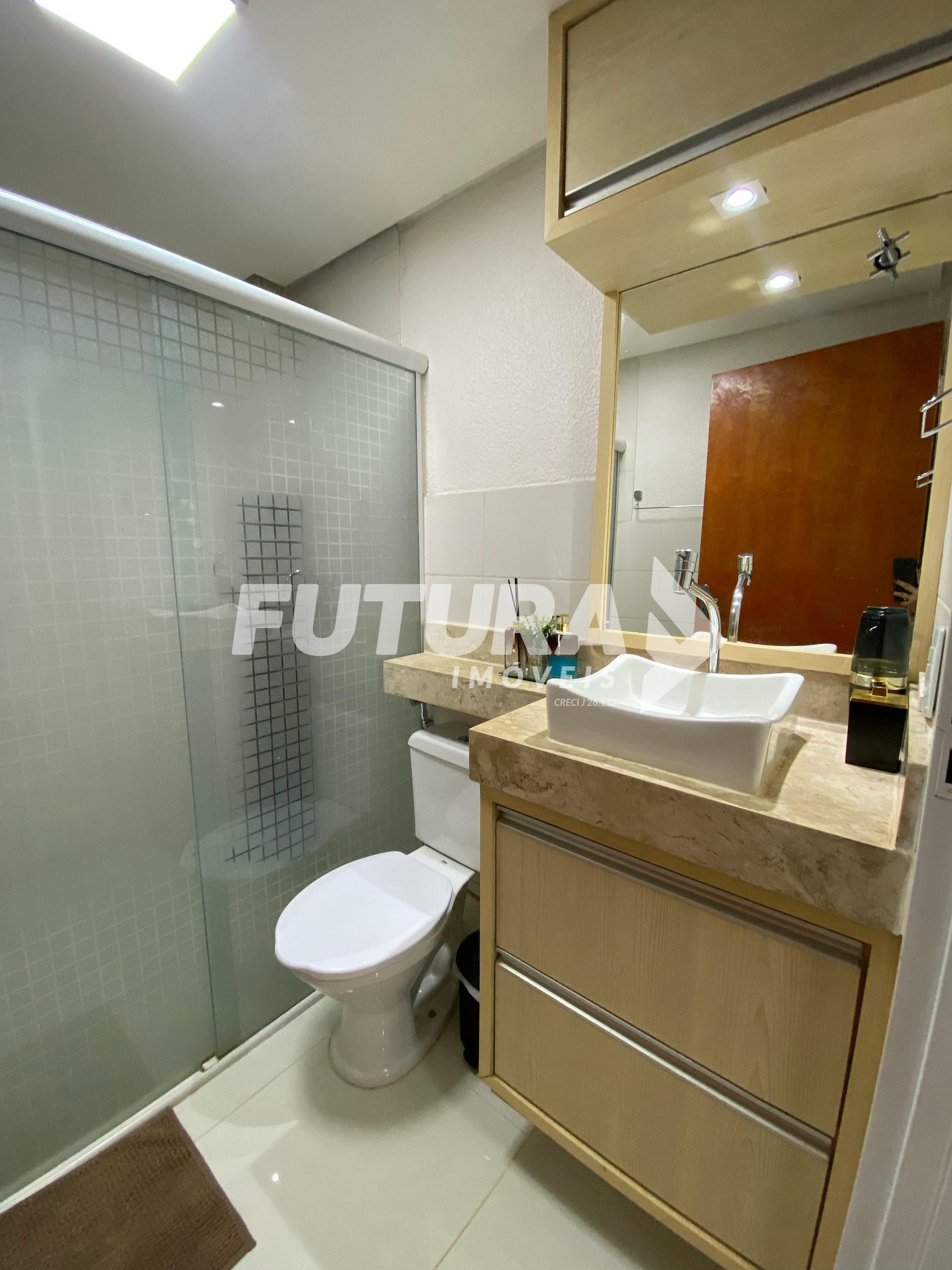 * ?Banheiro com armários, box e espelho.