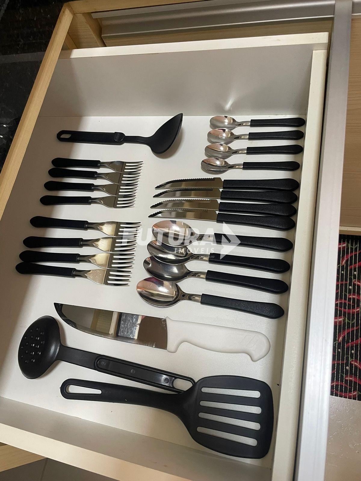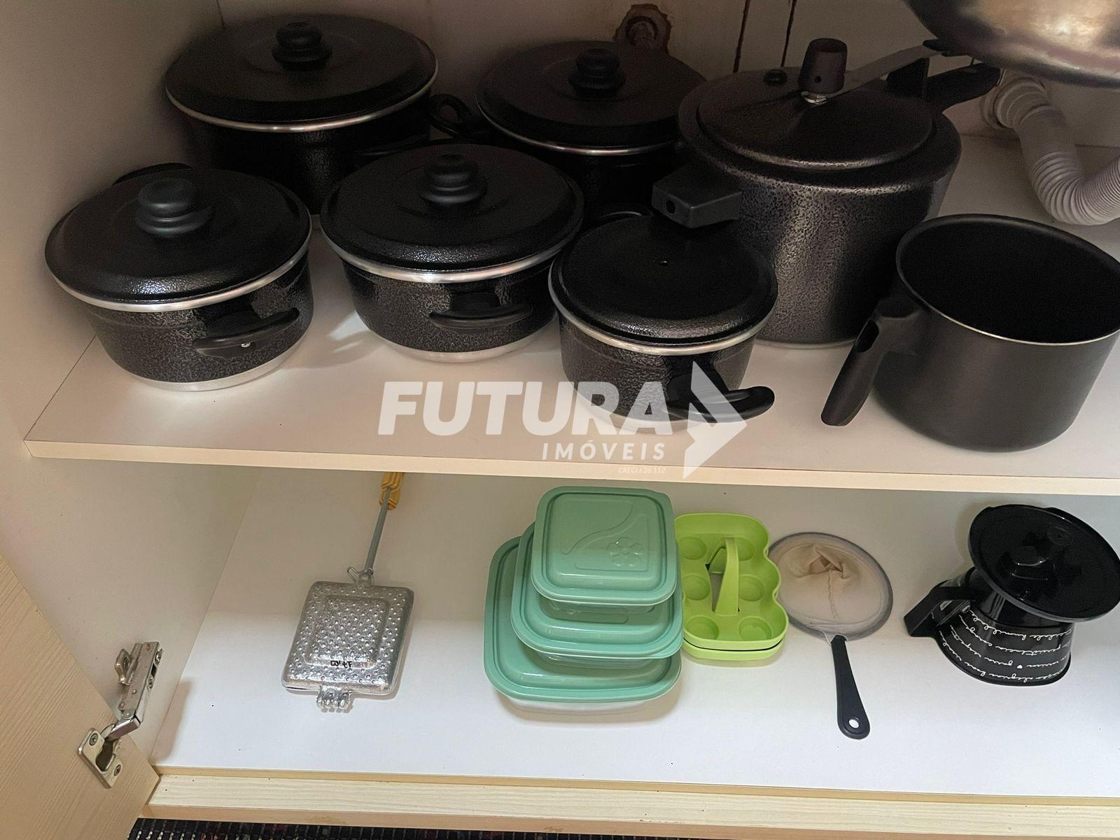 * ?Cozinha armariada conta com geladeira, microondas, filtro purificador de água , fogão cooktop, forno elétrico e Airfrier, equipada também com talheres , copos , pratos e panelas .