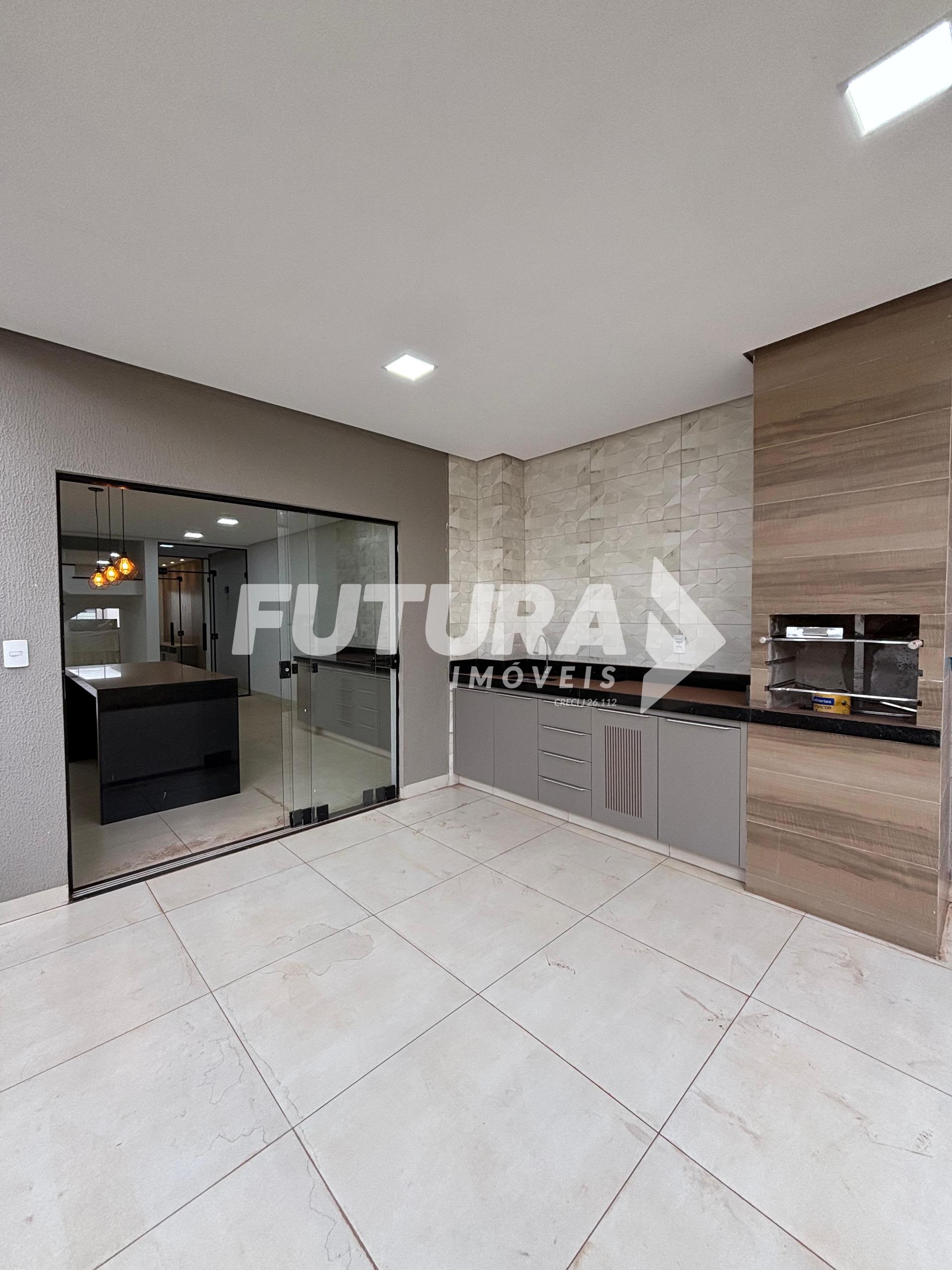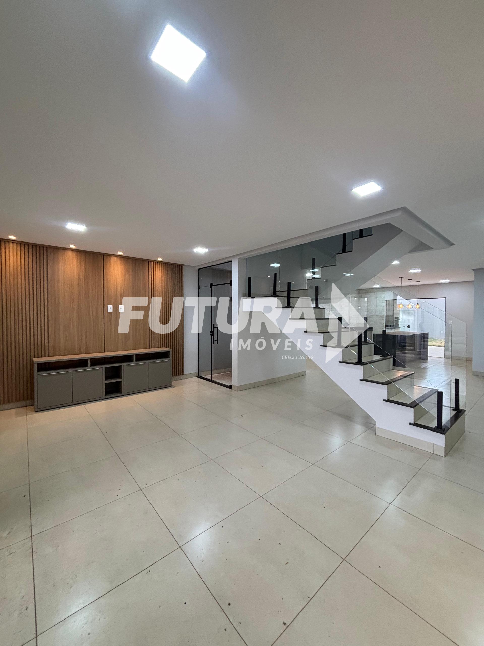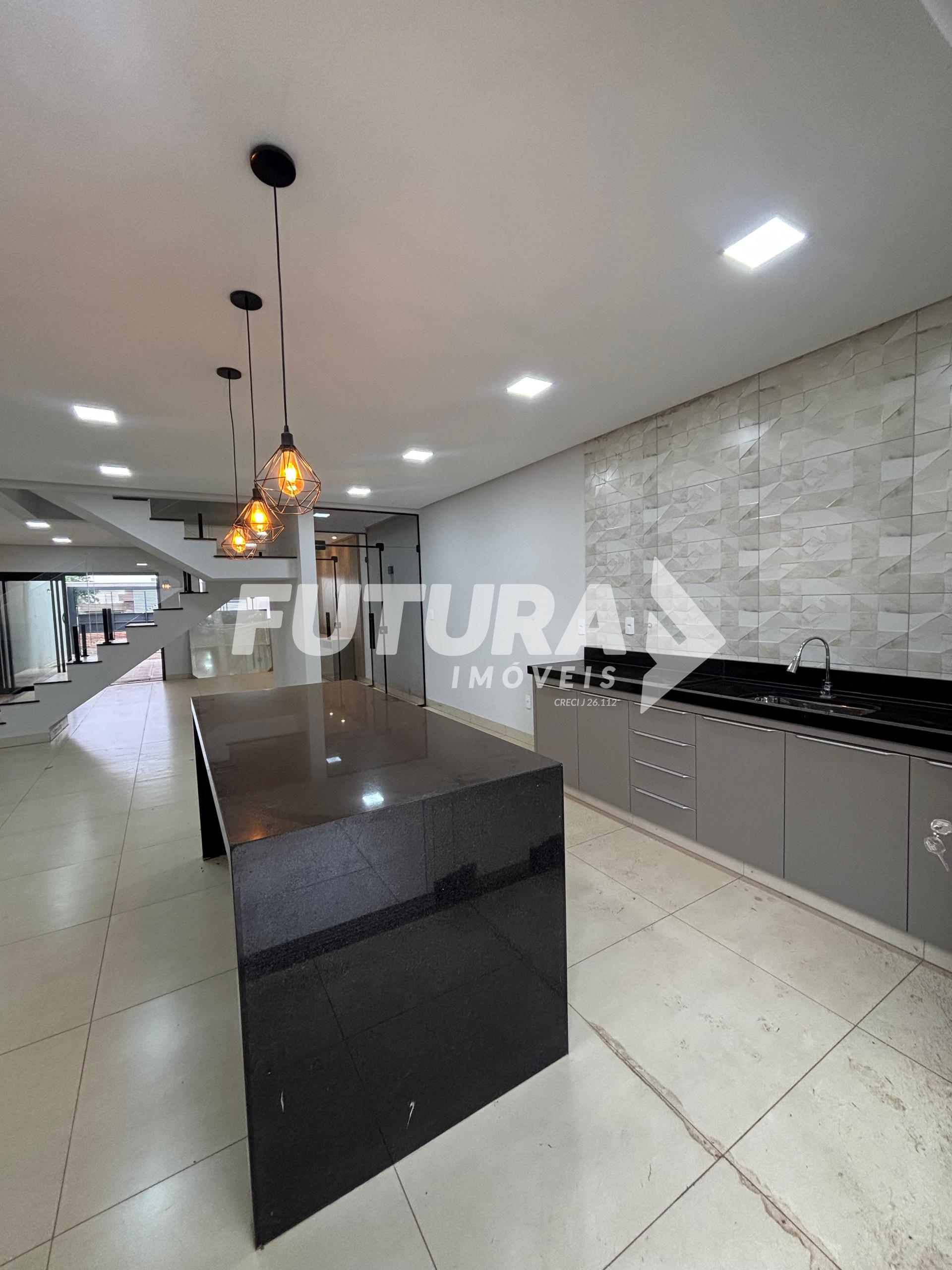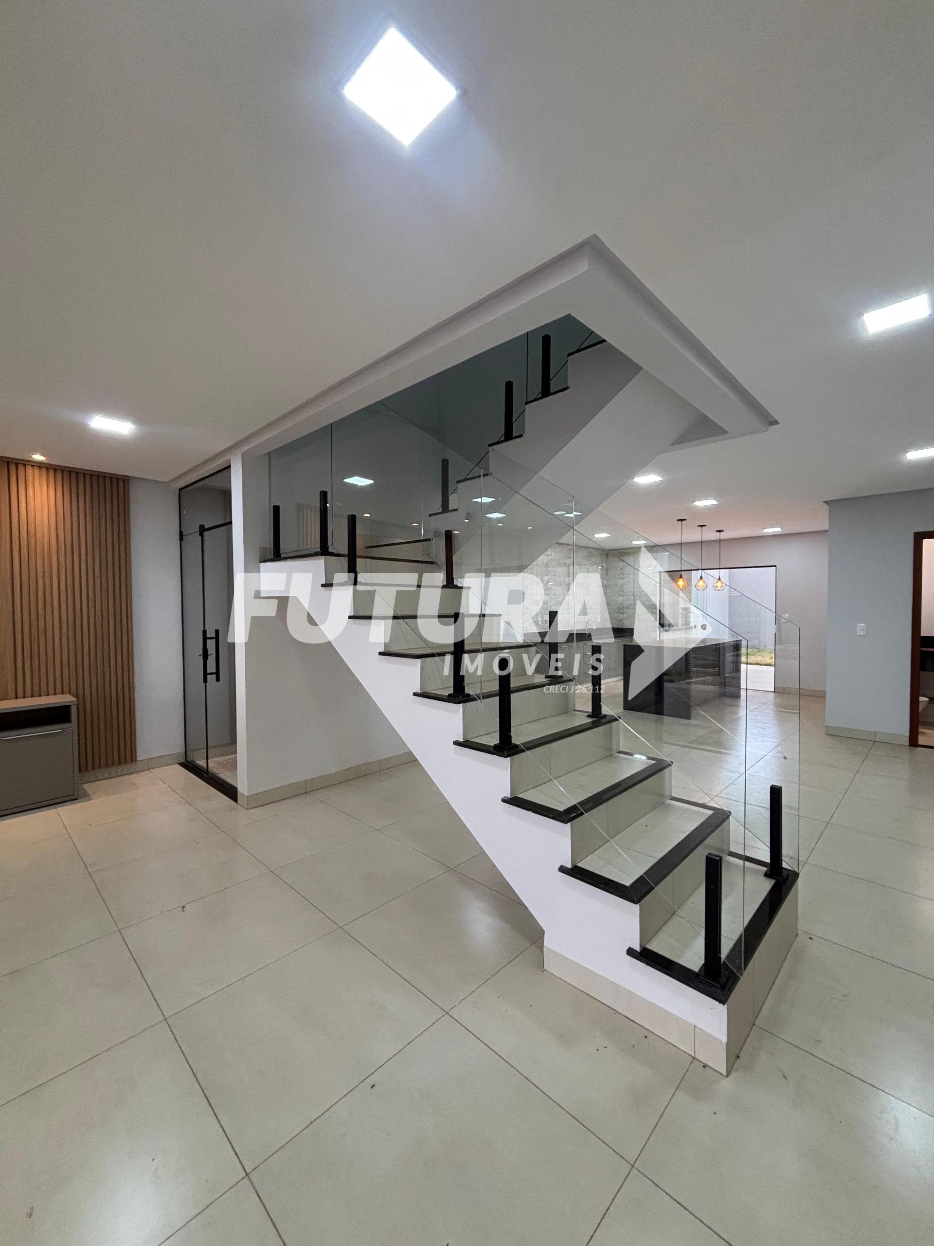 Piso inferior: Sala ampla, claraboia, cozinha em ilha, lavabo, área gourmet com churrasqueira, área de serviço coberta, quintal.